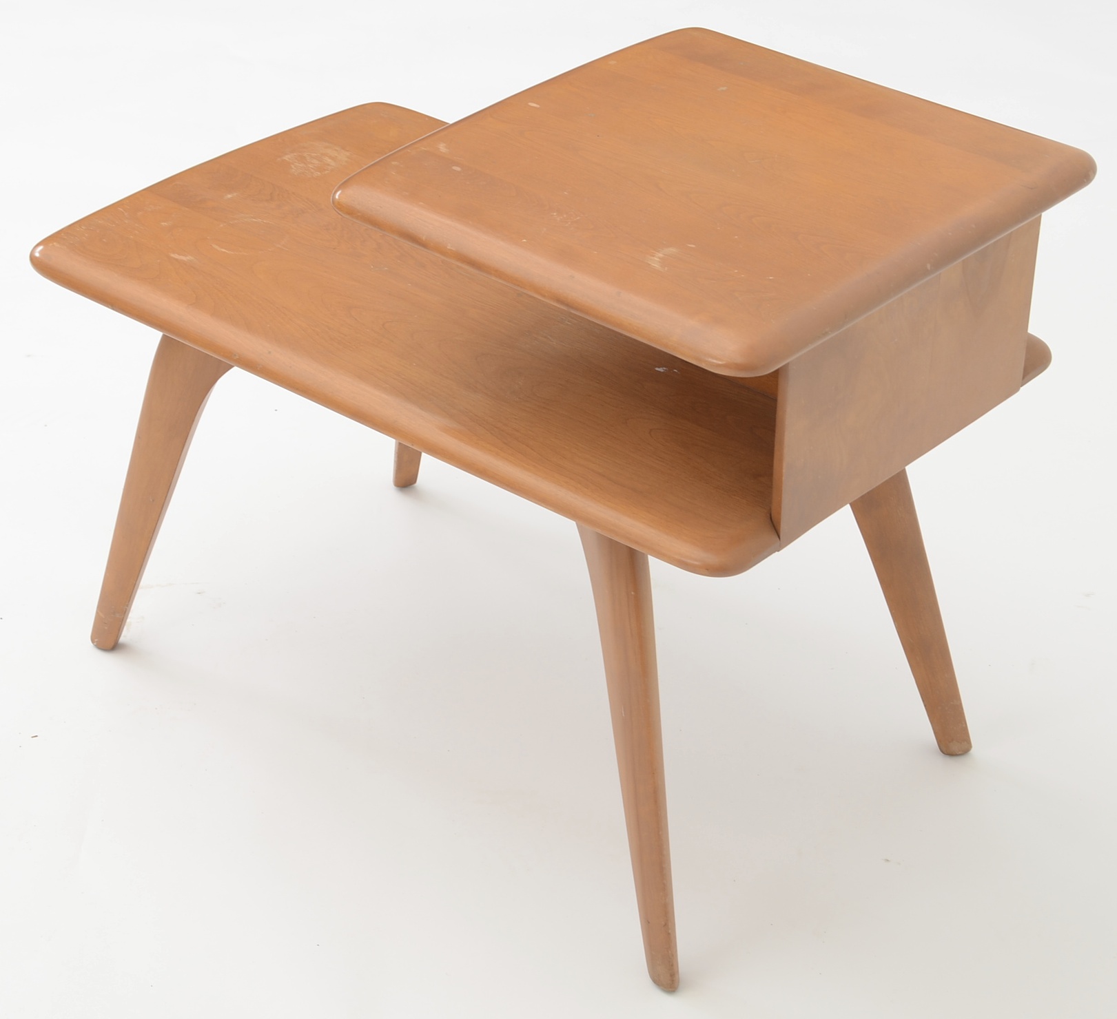 Heywood Wakefield Three-Tier Step End Table | Chairish from chairish-prod.freetls.fastly.net This a mid century modern 2 tiered side end table by heywood wakefield, with its signature curved design, champagne blonde finish, and 1 dovetailed drawer: The area 22 x 22 and 22 tall. Nice pair of heywood wakefield end tables to use beside a sofa or next to a pair of lounge chairs. End tables for sale on 1stdibs. Heywood wakefield end table or night stand marked teak 628 on back. The table stands 2 off the floor. Mid century modern 2 tiered side end table by heywood wakefield. There is 13 between the lower and middle shelf and 5 between the middle and the top shelf.